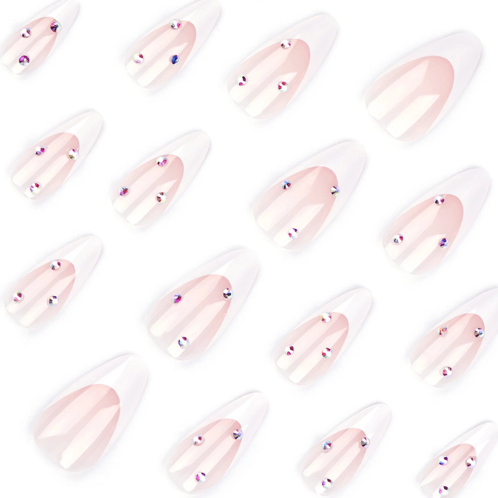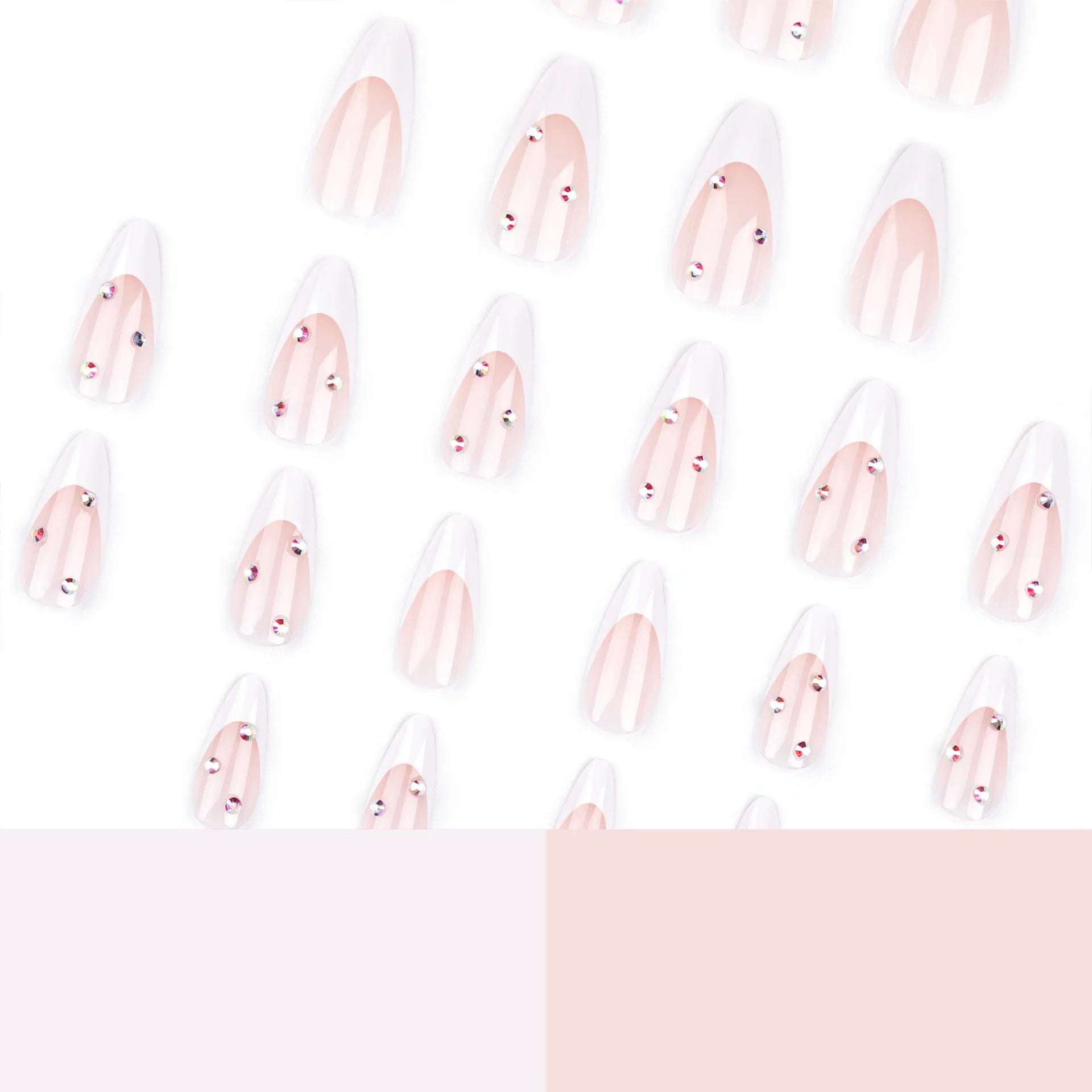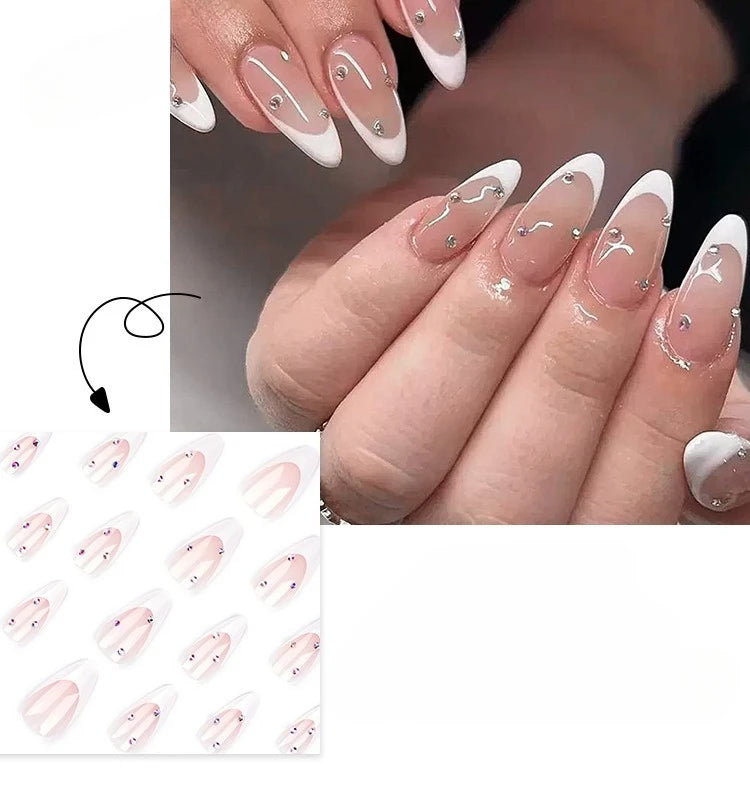 24pcs Simple French White Patchwork Fake Nails Sparkling Diamond Full Cover Almond Press on Nails Nail Tip