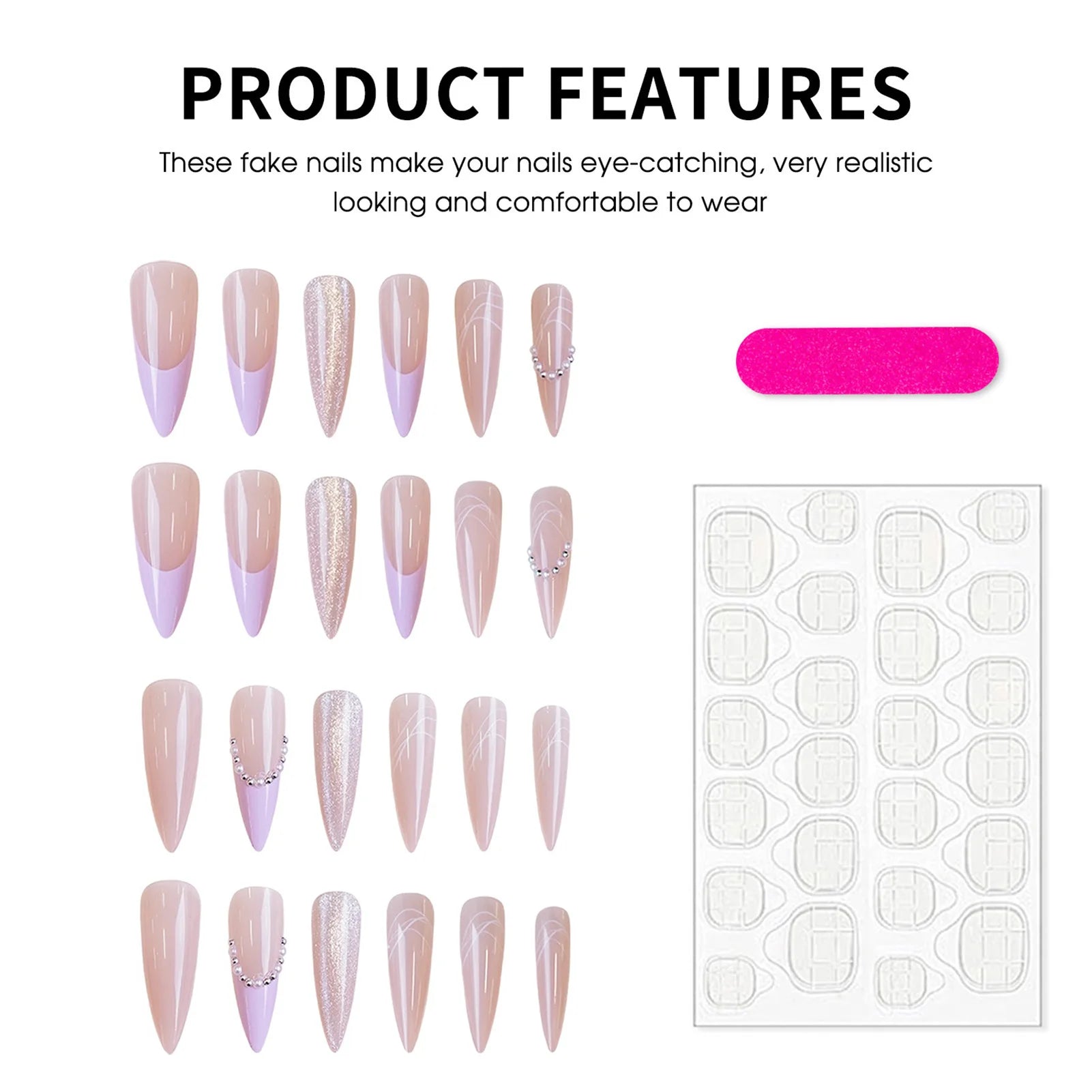Long Stiletto Fake Nails 24Pcs Purple French Press On Nails Gentle Women Charm Manicure Glossy Cat's Eyes/Beads Decor Nails Art