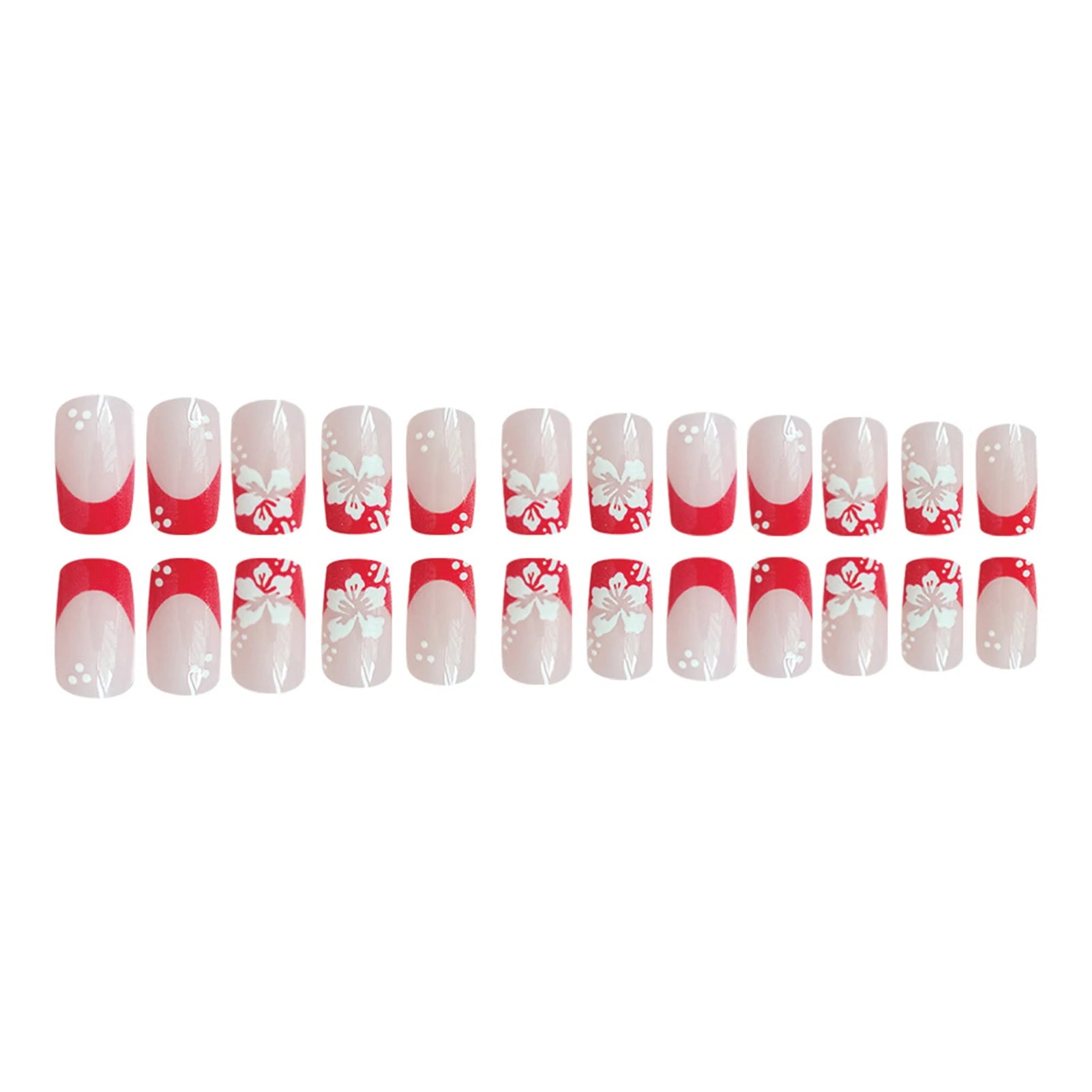 Red French Fake Nails 24Pcs Nude Color Square Head Press On Nails White Flower Printed Gentle Women Charm Manicure Nails Art