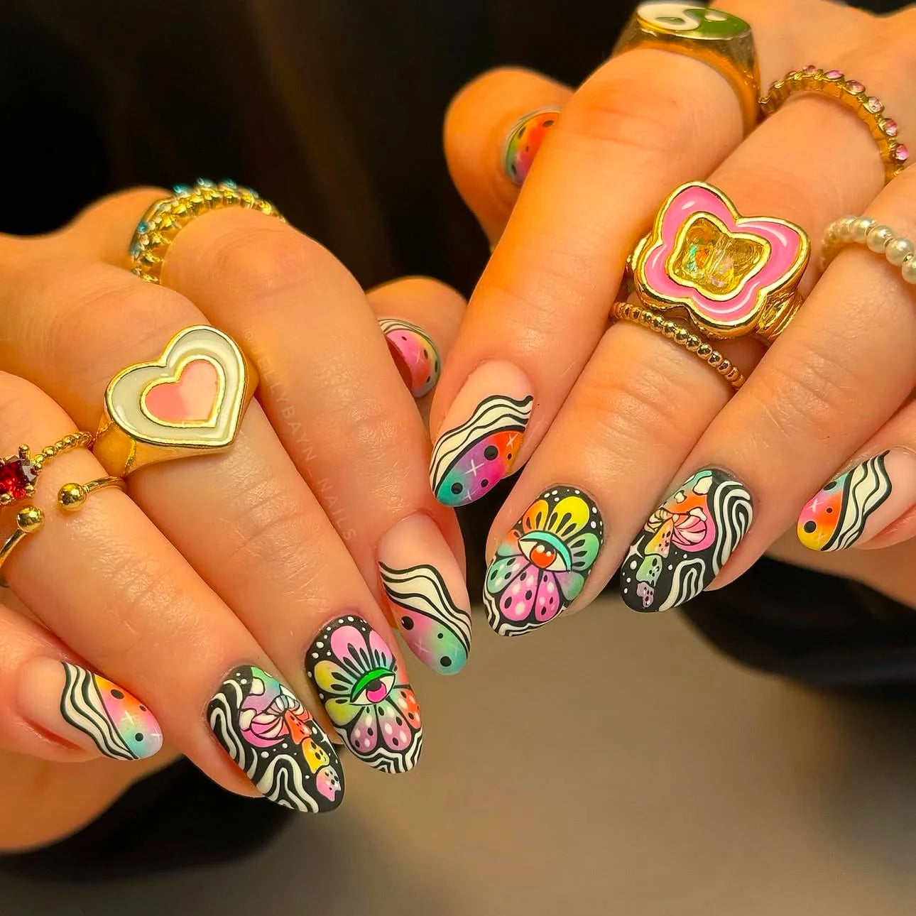 24Pcs Mid-length Round Head Nails Set Press on With Red Blue Design Fake Nails Flowers Leaves Pattern Almond False Nail Tips Art