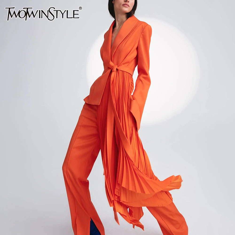 TWOTWINSTYLE Solid Spliced Folds Blazers For Women V Neck Long Sleeve Patchwork Lace Up Irregular Chic Blazer Female Fashion New