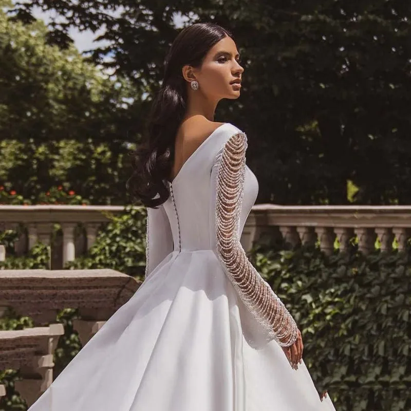 Simple Satin A Line Wedding Dress Boat Neck Full Sleeve Long Dresses Vintage Button Beading Elegant Gowns Dress Custom Made