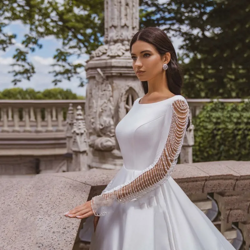 Eenvoudig satijn een lijn trouwjurk boot nek volle mouw lange jurken vintage knop kralen elegante jurken jurk op maat gemaakt
