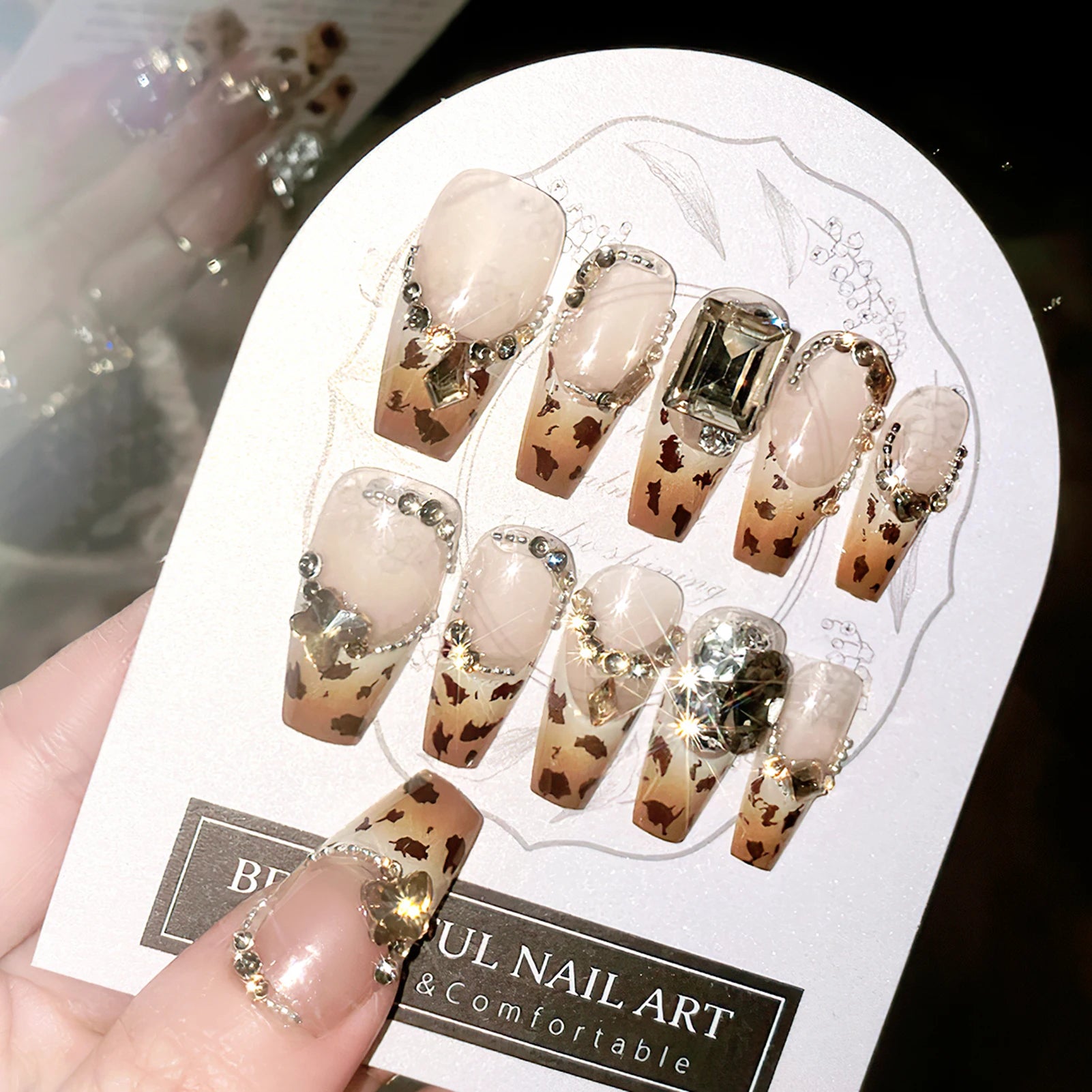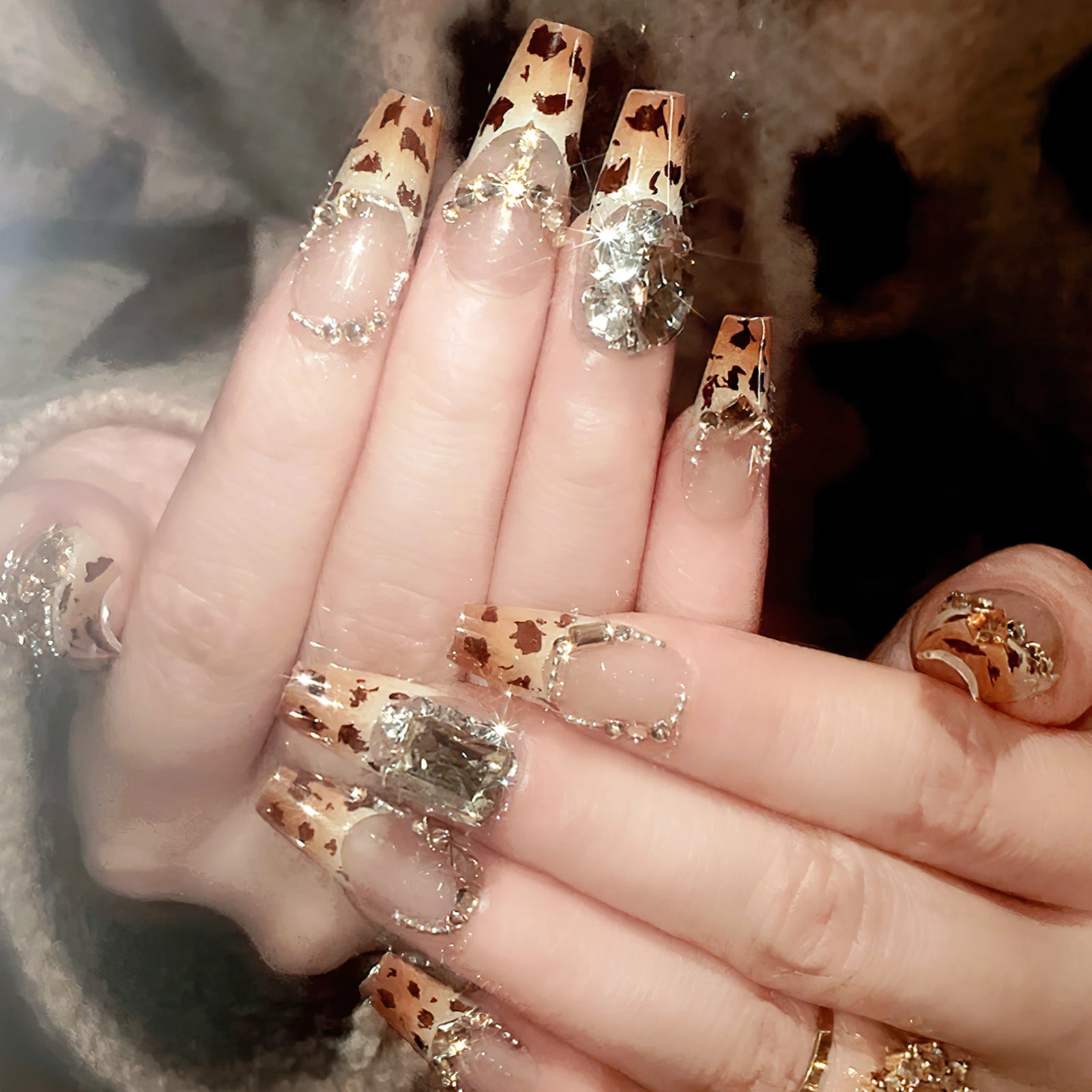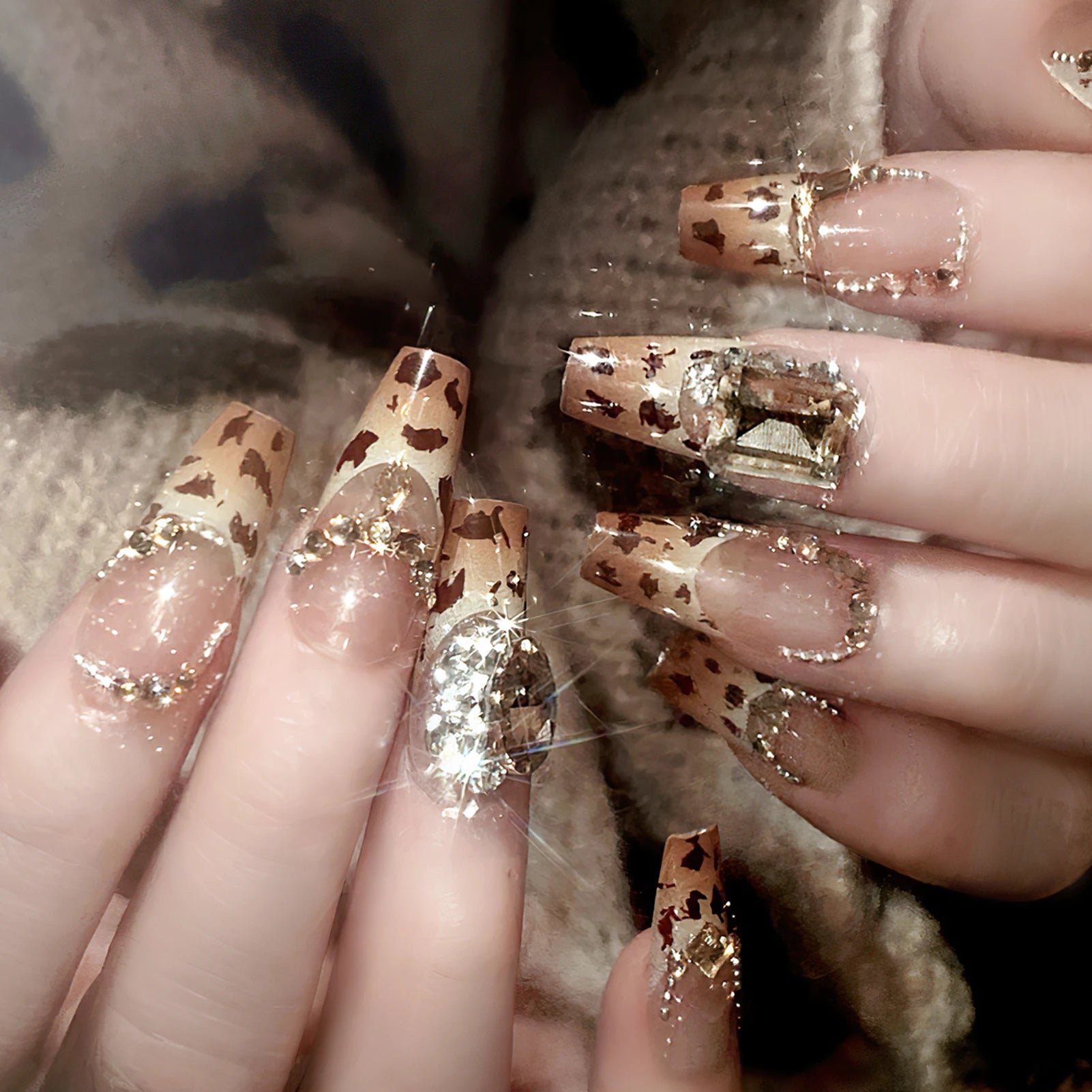 Autumn Winter Leopard Printed French Press On Nails 24Pcs Medium Length Coffin Fake Nails Shiny Diamond Decor Wearable Nails Art