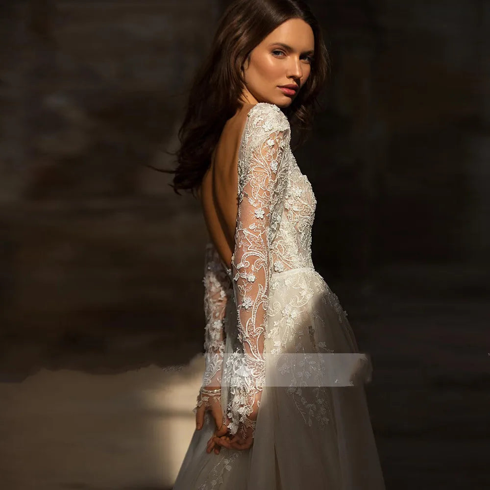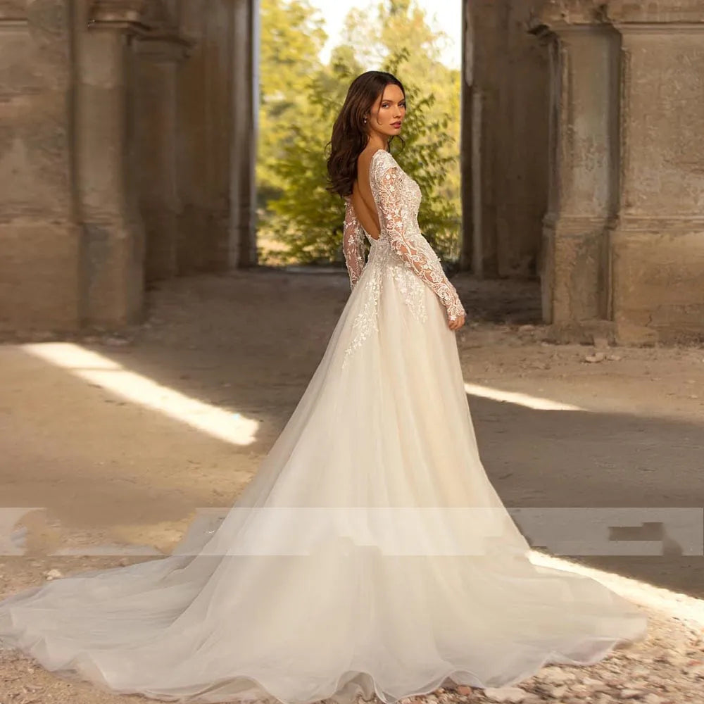 Sexy V-Neck A-Line Wedding Dress Lace Appliques Long Sleeves Open Back Bridal Gown For Women Custom Made Vestido De Novia