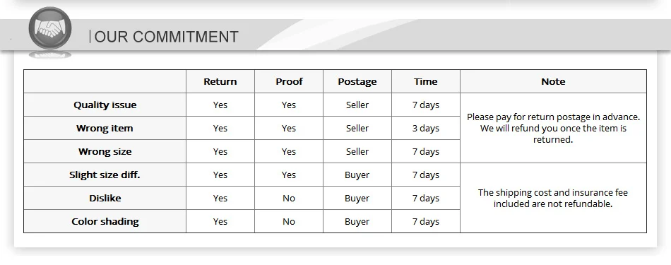 Please note that all return requests must be accompanied by supporting pictures of the product. The return request will be considered valid and effective only once we have received and reviewed the product pictures.